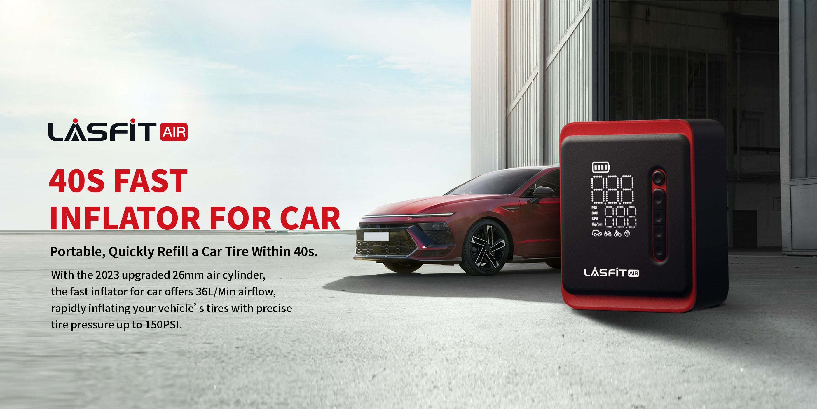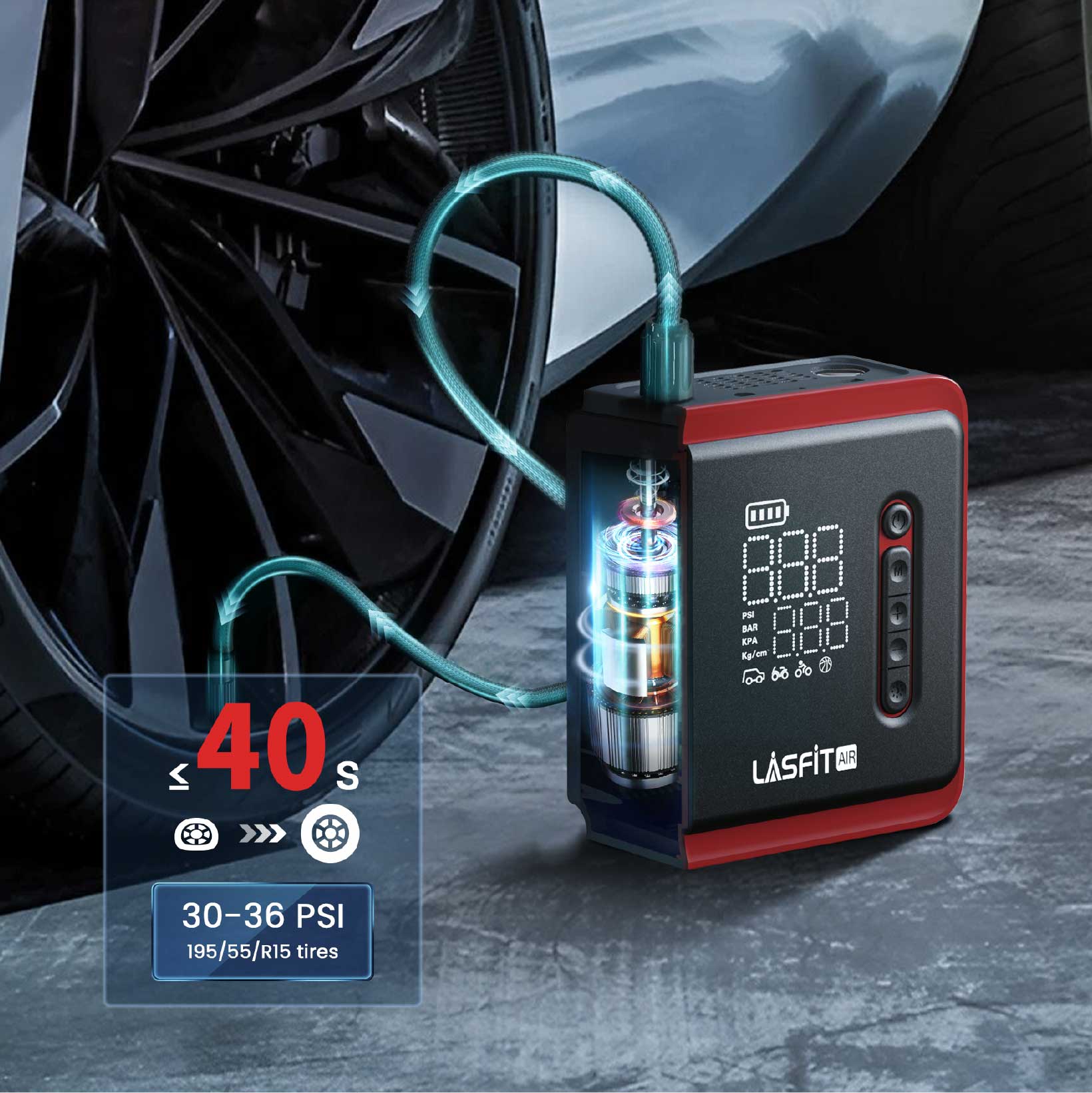 - 【3X Fastest Inflation M1 Air Cyliner】Equipped with innovative M1 air cylinder in 26mm diameter(85% larger upgraded from 14mm to 26mm) developed by LASFIT AIR, LASFIT AIR CR1 tire pump produces 36L/min airflow. This upgraded M1 air cylinder adapts premium aerospace alloy material, matches with 120W powerful motor producing 22000rpm, ensure you an unprecedented 3X fast inflation experience.