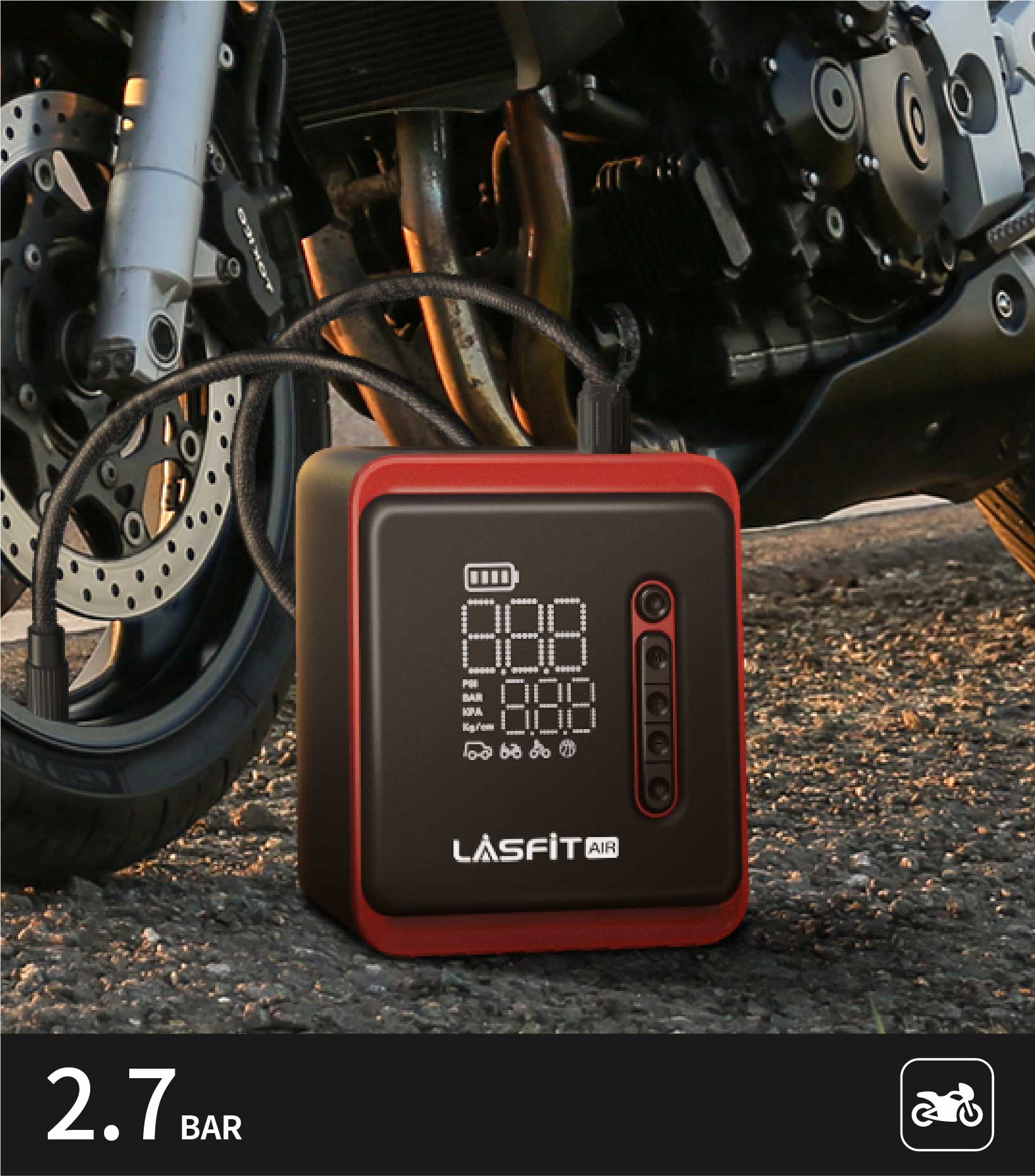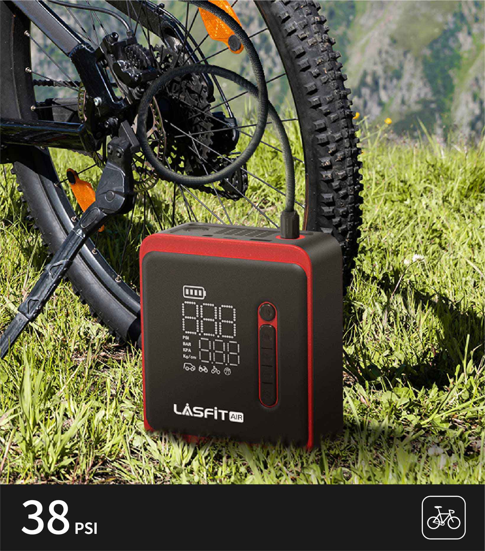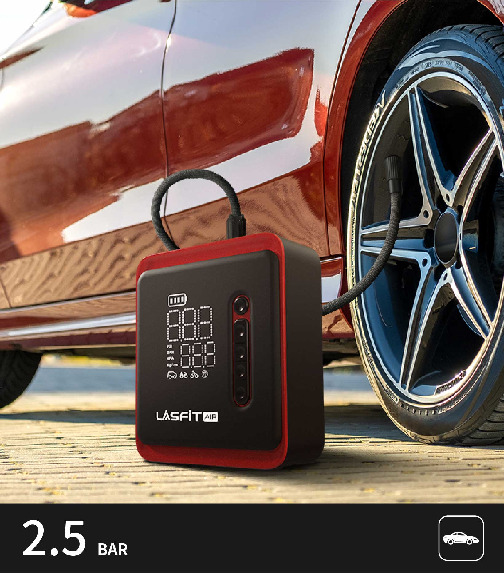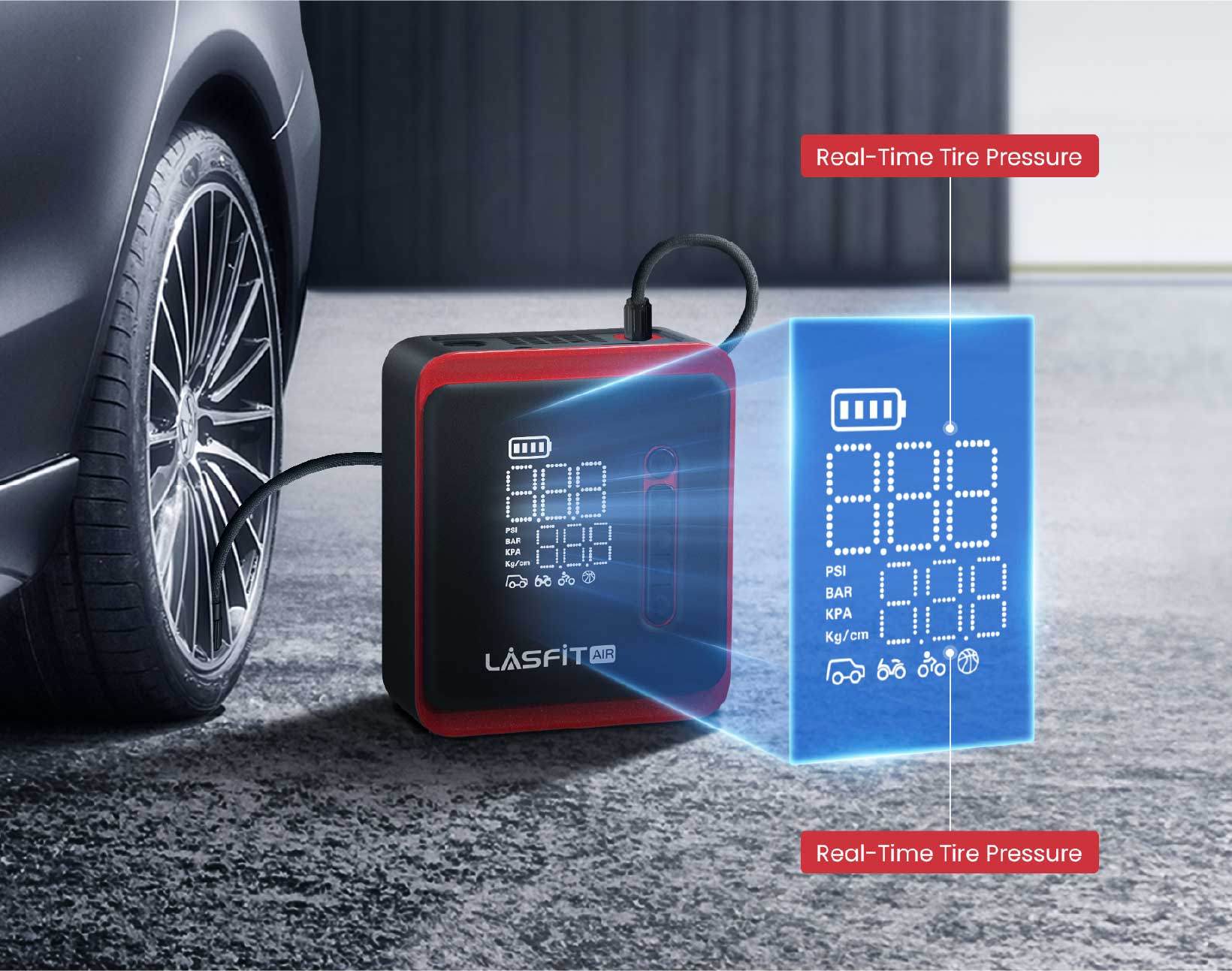 - 【Smart Air Pump, Easy to Use】LASFIT AIR CR1 auto tire inflator comes with LED real time digital pressure gauge screen, easy for accurate readings. You just need to choose the modes(car, bike, motorcycle, ball, customized modes) with your desired preset pressure, connect the tires with hoses, then press the power button to start inflating your tires. This tire inflator portable air compressor will auto shutoff when the desired PSI is met.