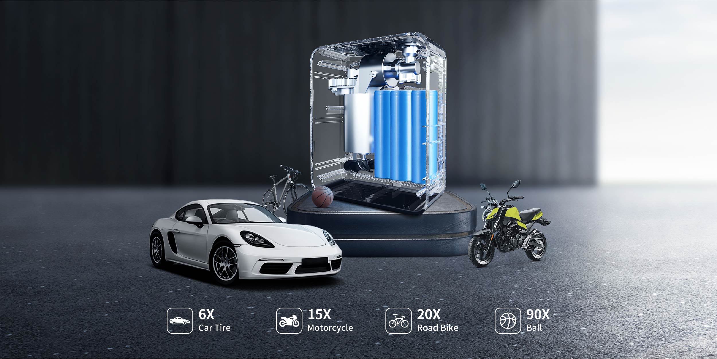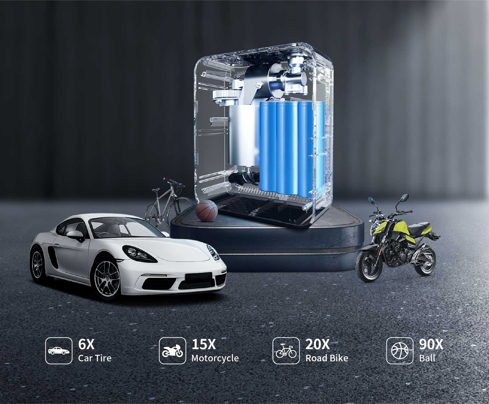 It takes less than 1 minute to refill a 225/50/R17 car tire from 29 to 36 PSI. Small and compact to store in a glovebox, bike frame or backpack, It is a portable car air pump for cars, SUVs, motorcycles, and bicycles.