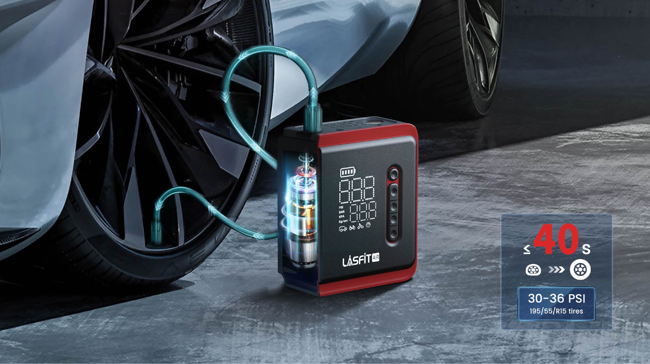 - 【Fast Inflation for All Tire Emergencies】LASFIT CR1 portable air pump is designed for fast inflating all tires(tire width<255mm) from 2PSI to 150PSI, eg. Inflate 195/55/R15 tires from 30PSI to 36PSI in 40 seconds. It is compatible with all cars like sedans(eg. Camry, Carrolla, Model 3, Accord, TEANA, Civic, etc.), SUVs(eg. Tesla model Y, RAV4, CR-V, Grand Cherokee, Highlander, Equinox, etc.), minivans, EVs, motorcycles, UTVs, ATVs, bikes, ebikes, road bikes, mountain bikes, etc.