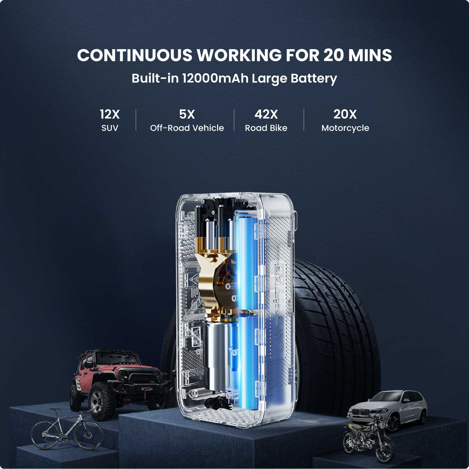- Portable & Cordless: With a dimension of 7.4*3.8*2.4 inches and a weight of 2.3lb, it's compact and lightweight, designed for ultimate portability. The built-in super 12000mAh battery provides on-the-spot inflation for your vehicle, offering peace of mind in any emergency.