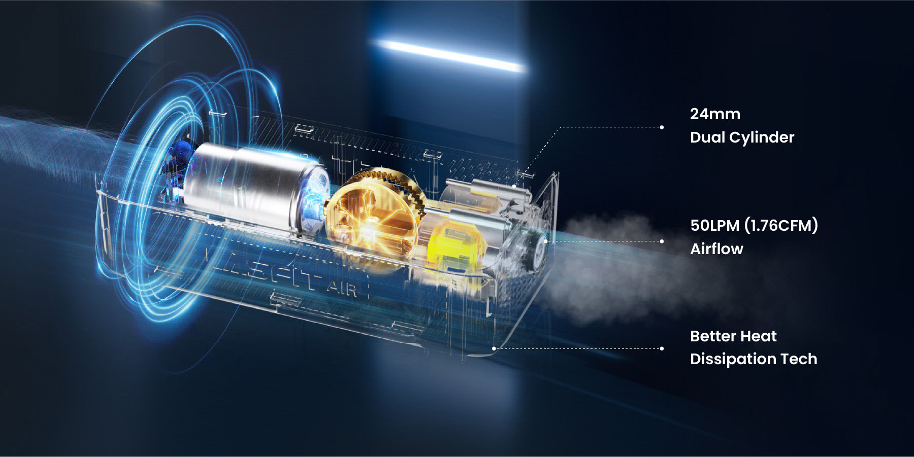 - Tech Revolution: Innovative 24mm dual cylinder technology, delivers X3 faster inflation and makes it small yet strong. With an airflow rate of 50LPM (1.76CFM), it can fully inflate your light trucks' tire in just 3 minutes ( 285/70/R17 tires 29-36 PSI).