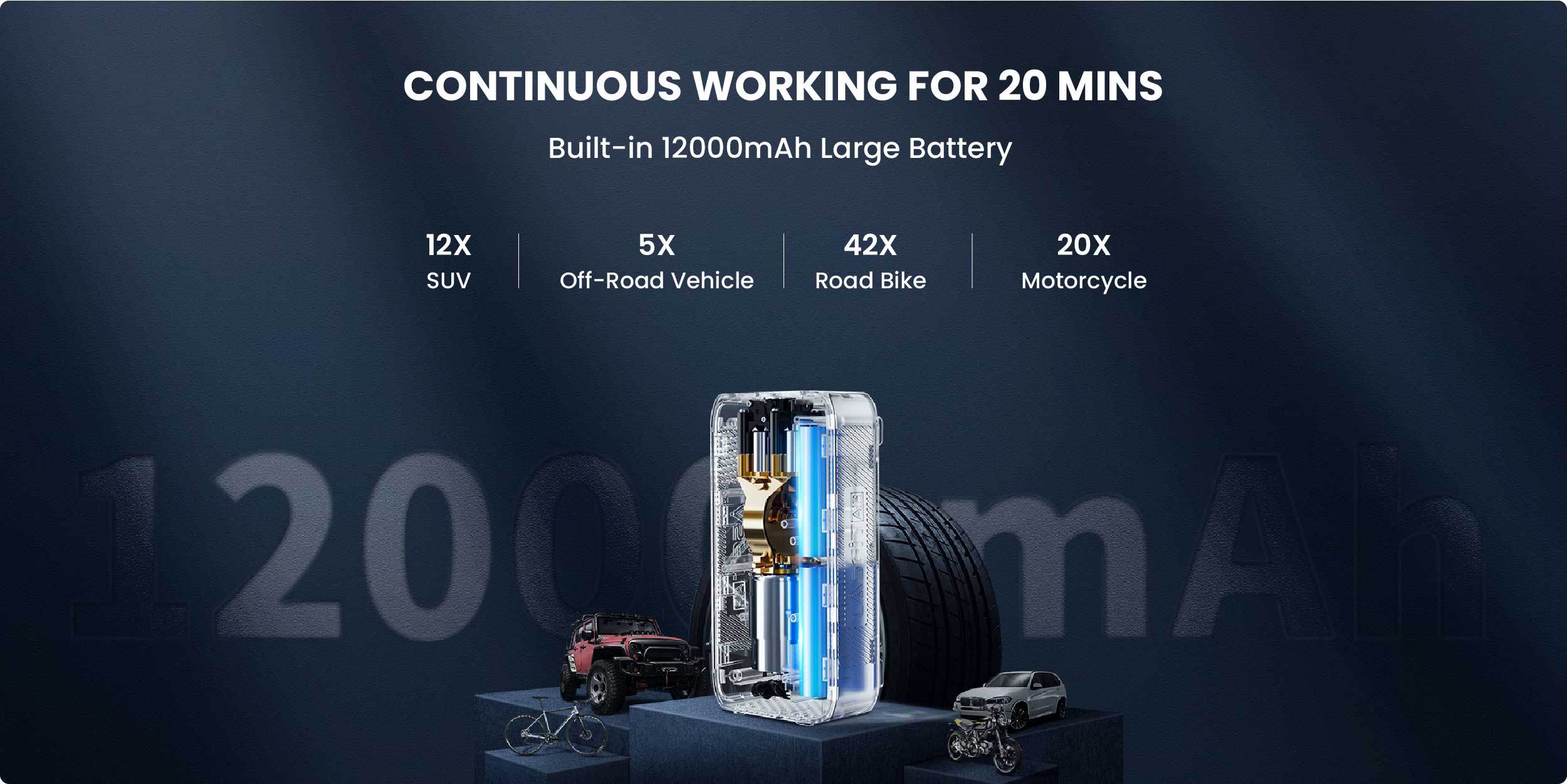 A: The built-in super 12000mAh battery provides on-the-spot inflation for your vehicle, offering peace of mind in any emergency.