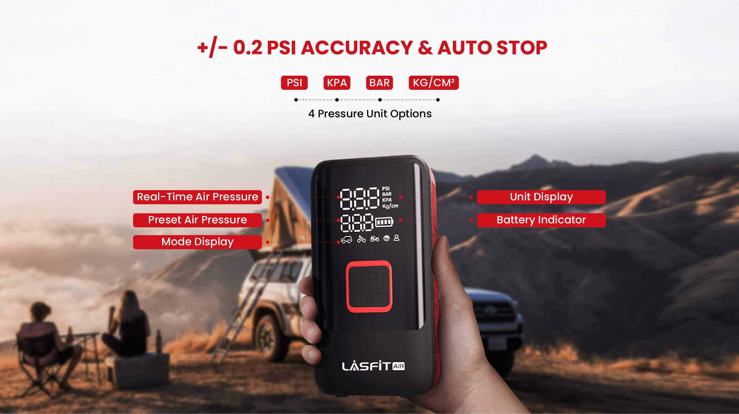 - Accurate Digital Pressure: With high-precision sensors and different calibration algorithms in different modes to ensure precise pressure control--accuracy error of +/- 0.2 PSI. The auto-stop function ensures worry-free inflation, offering a safe and reliable user experience.